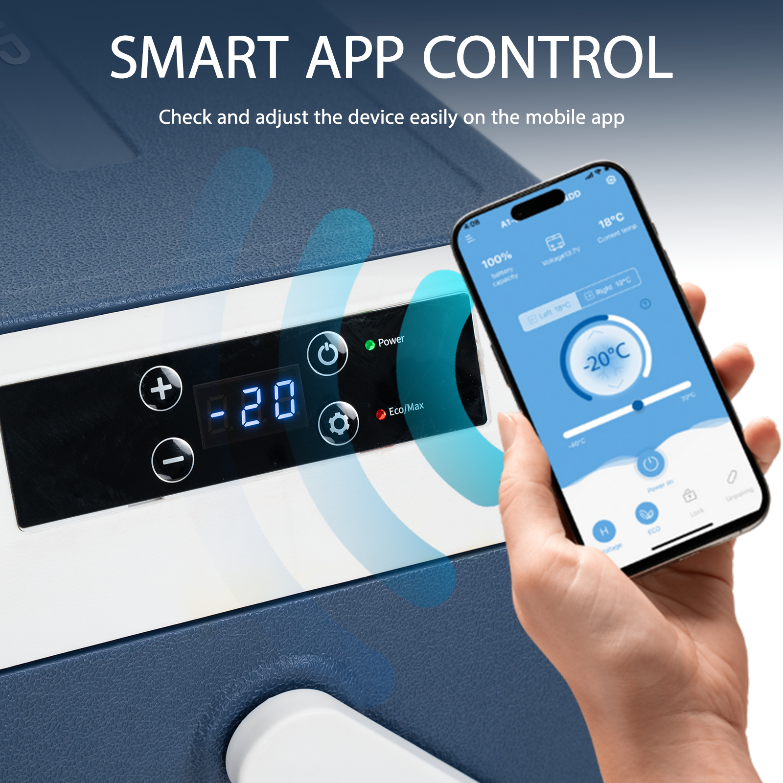 This 20QT (19L) portable 12V cooler uses single-zone temperature control and works as both fridge and freezer with stable, adjustable cooling. It provides multi-stage battery protection and supports fast cooling/energy saving modes, perfect for long journeys. Rugged and vibration-resistant, it keeps consistent cooling on rough terrain and slopes, with integrated handles and a reinforced door latch for safe outdoor transport.
