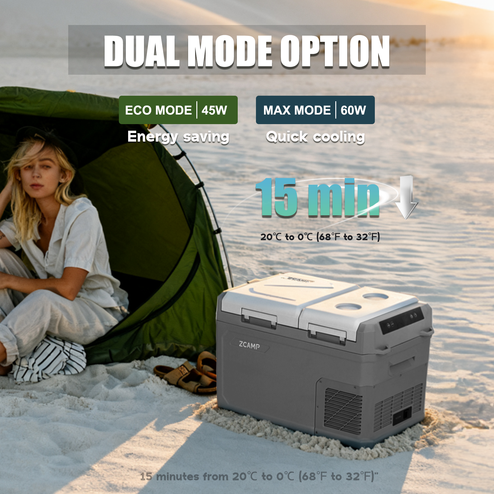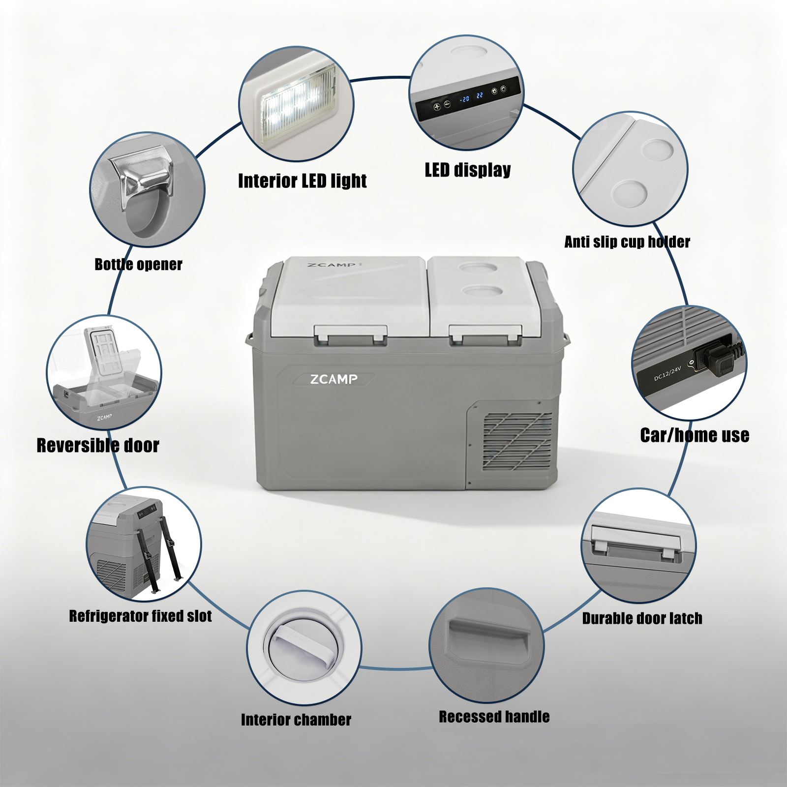 Quiet below 45dB, it includes an LED display, interior light, cup holders, drain plug and bottle opener, ideal for cars, RVs, boats, camping and home use.