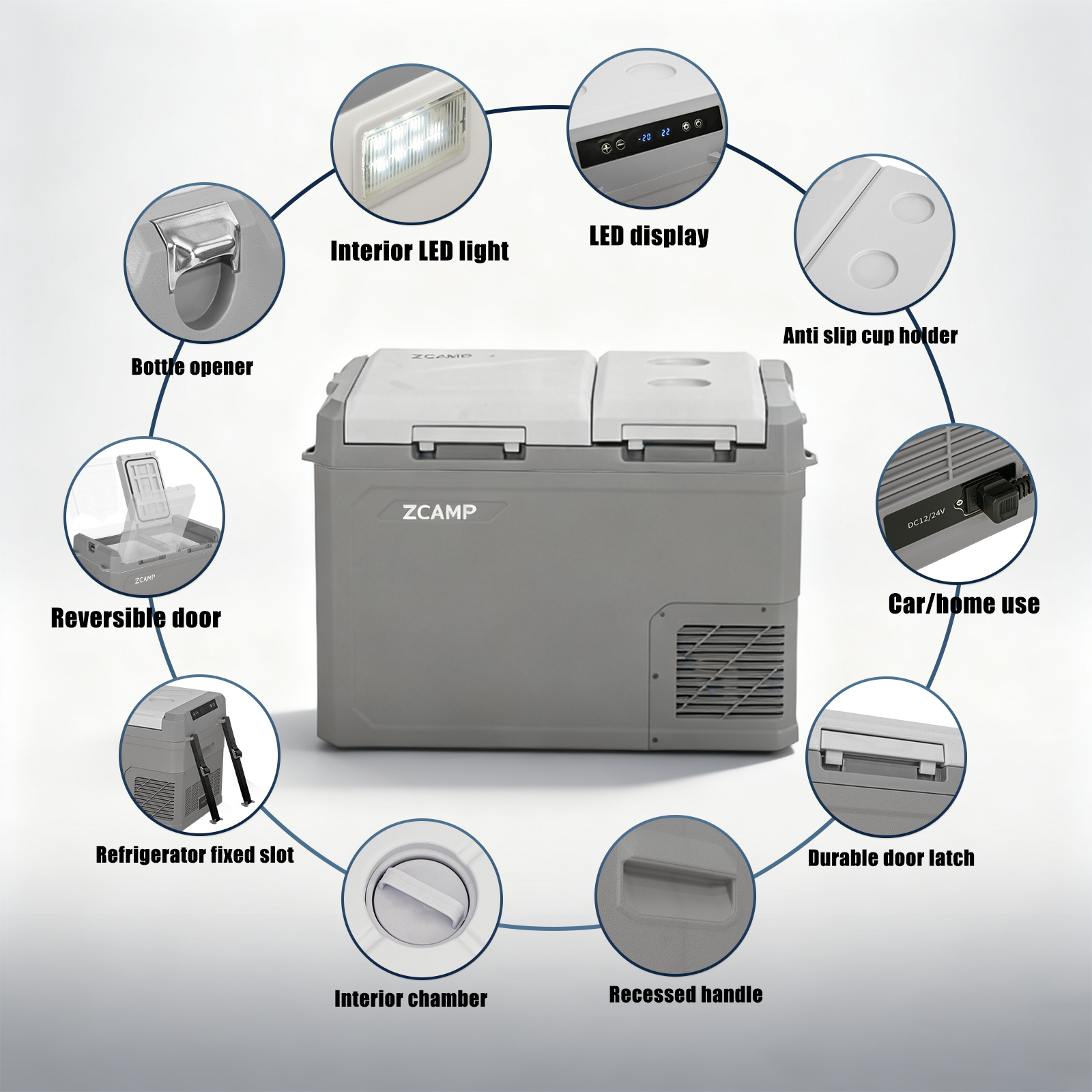 This 34QT (32L) 12V portable cooler features dual-zone independent temperature control from -4°F to 68°F, functioning as both fridge and freezer with fast cooling from a high-performance compressor. It has on-unit controls and a reversible door for flexible installation.