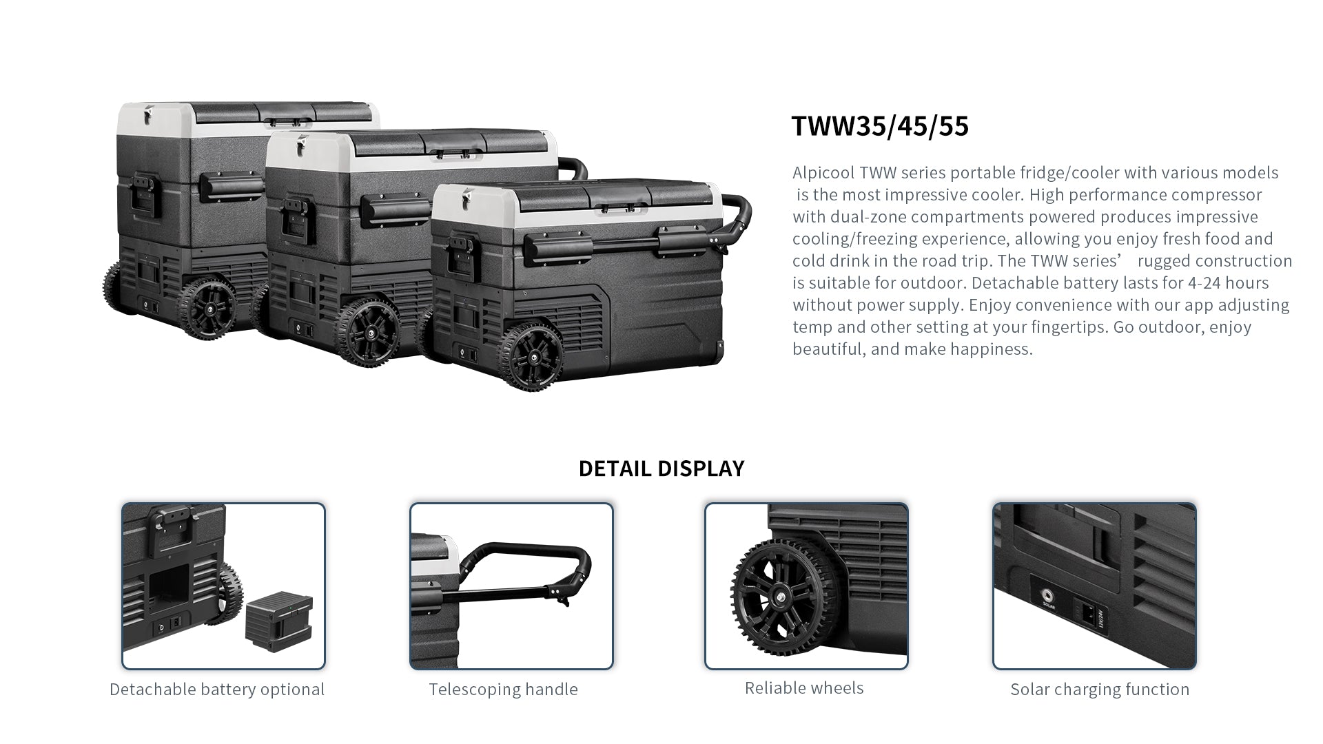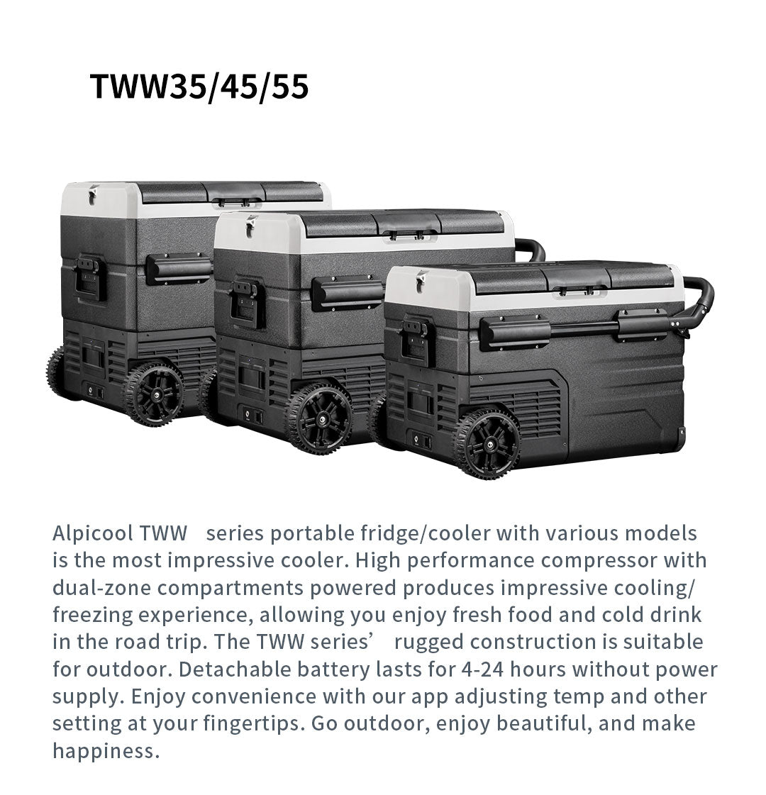 The Alpicool TWW55 Portable Dual Zone Car Fridge With Wheels is a must-have for any outdoor excursion. Equipped with dual individual zones and temperature controls, it can cool your food and drinks to as low as -20℃ and as high as 20℃. With a spacious 54.2l/57qt capacity and optional detachable battery (sold separately), you can take it on any adventure - from picnics and BBQs to camping and family trips. Its app control and versatile usage options (car, home, solar) make it a versatile and convenient choice. Plus, the wheel and telescoping handle make it easy to transport. Don't forget the reversible door for added flexibility.